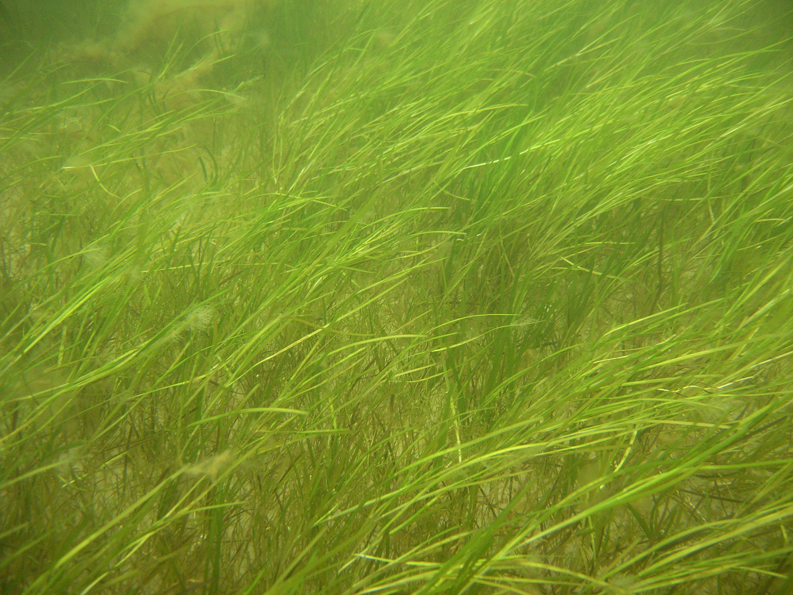 Na zdjęciu widać łąkę podwodną w morzu Bałtyckim składającą się z zielonych traw i wodorostów (Po kliknięciu zdjęcie się powiększa)